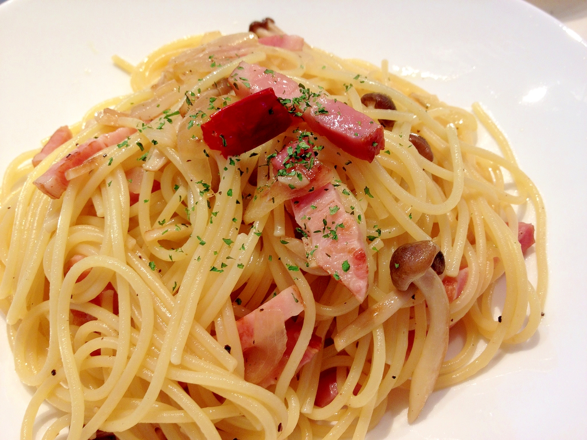 しめじとベーコンとタマネギの和風ガーリックパスタ レシピ 作り方 By johncompany 楽天レシピ
