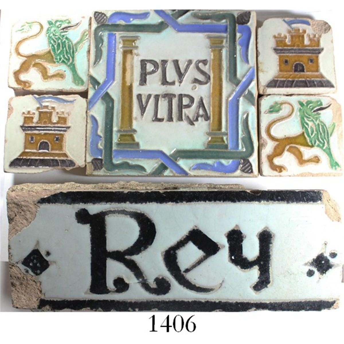 Lot Of 6 Ceramic Tiles From Spain Showing Plvs Vltra Lions 2 Castles 2 And Rey Time Period U